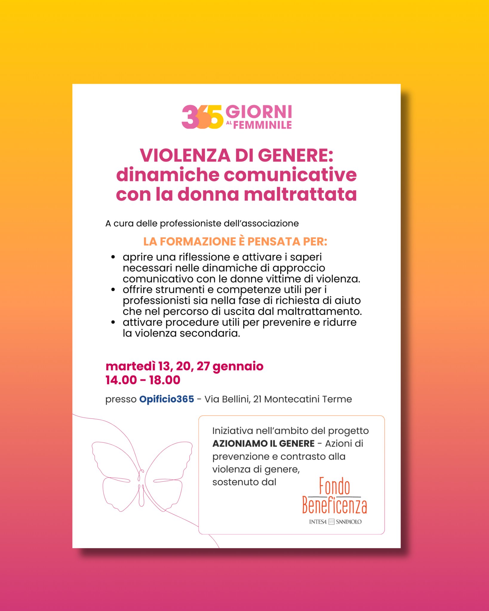 Opificio 365 Via Bellini 21, Montecatini Terme, PT, ItalyOccasione Formativa per i Professionisti della Rete Antiviolenza Iniziativa nell'ambito del progetto “Azioniamo il Genere”, sostenuto dal Fondo di Beneficenza ed opere di carattere sociale e culturale di Intesa Sanpaolo. […]